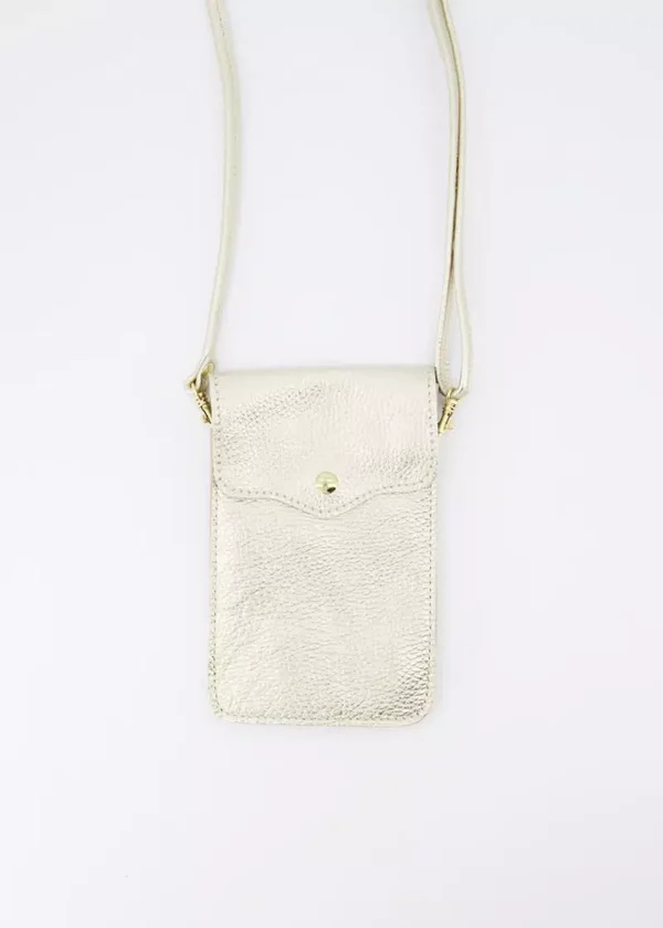 Handig leren telefoontasje met 2 vakjes aan de binnenzijde. De tas heeft een lang hengsel en magneetsluiting.